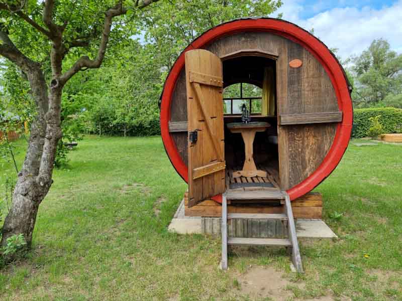 Buche deinen Aufenthalt im Schlafffass und genieße die Einfachheit und den Charme des Übernachtens in der Natur!