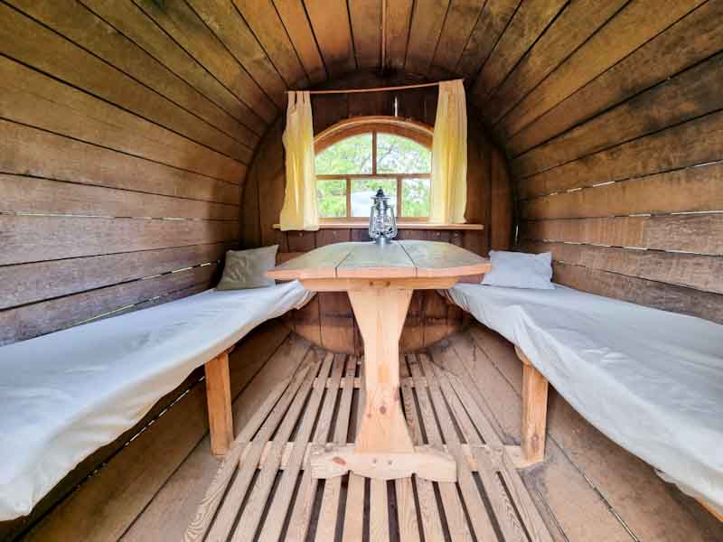 Das Schlafffass bietet dir zwei Betten und einen Tisch – ideal für alle, die eine naturnahe Übernachtung suchen, ohne auf den Sternenhimmel und die Ruhe der Umgebung zu verzichten. Es ist der perfekte Ort für Abenteuerlustige, die den Tag auf dem Wasser verbringen und die Nacht in einer besonderen Atmosphäre ausklingen lassen möchten.